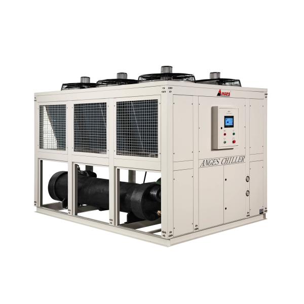 Air-cooled industrial screw chillers are from 120kw to 760 kW (34 to 216tons) which used for heavy-duty industrial applications, generally require less space than a water-cooled chiller. You can normally install the air cooled chiller on a rooftop, in a parking lot or anywhere else you have open space available.
